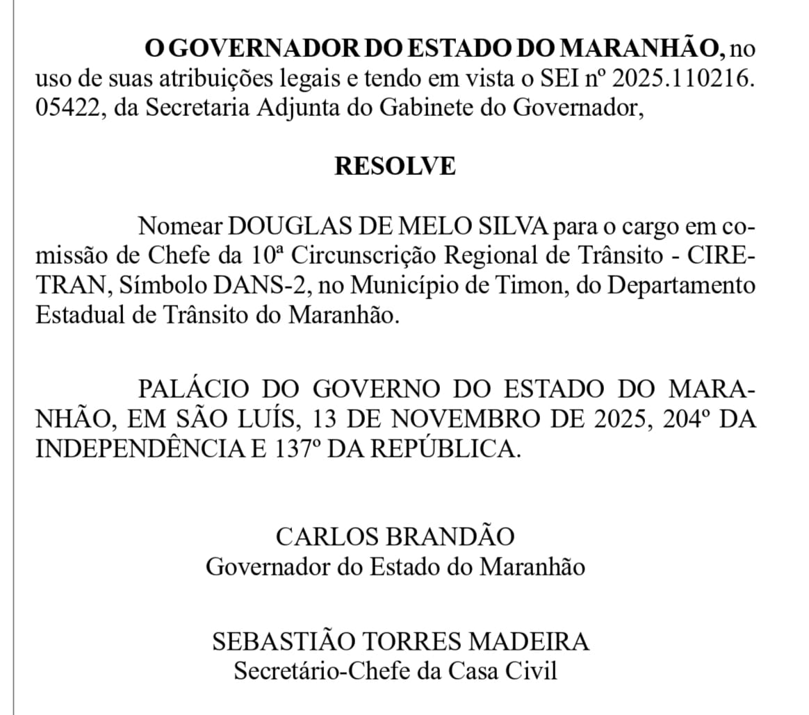 A 10ª Ciretran de Timon passa por uma mudança estratégica no seu comando. O governador Carlos Brandão nomeou, no dia 13, o agente de Polícia Civil Douglas de Melo Silva para chefiar o órgão, em substituição a Raylton Almeida Costa.